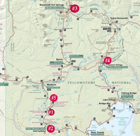 Recommended routes into and thru Yellowstone National Park from each entrance for earliest access to primary locations.