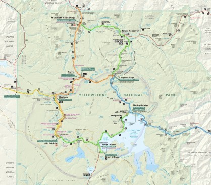 - Orange – North Entrance and Gardner to Mammoth Warm Springs on to Midway Geyser Basin or alternately to Lookout Point.