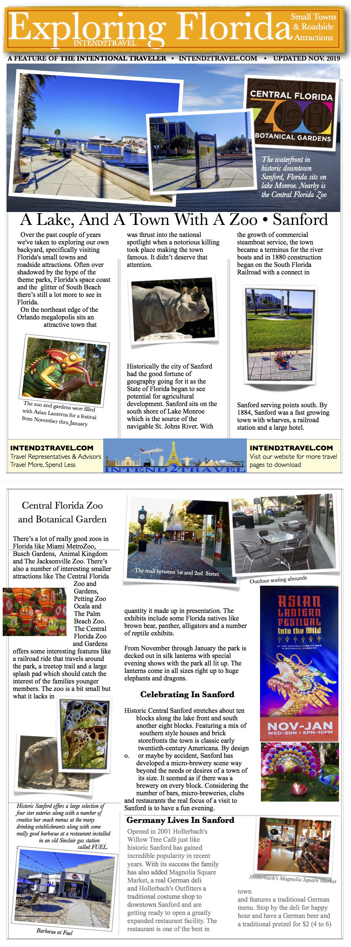 There’s a lot of really good zoos in Florida like Miami MetroZoo, Busch Gardens, Animal Kingdom and The Jacksonville Zoo. There’s also a number of interesting smaller attractions like The Central Florida Zoo and Gardens, Petting Zoo Ocala and The Palm Beach Zoo. The Central Florida Zoo and Gardens offers some interesting features like a railroad ride that travels around the park, a treetop trail and a large splash pad which should catch the interest of the families younger members. The zoo is a bit small but what it lacks in quantity is made up in presentation. The exhibits include some Florida natives like brown bear, panther, alligators and a number of reptile exhibits. Historic Sanford offers a large selection of four star eateries along with a number of creative bar snack menus at the many drinking establishments along with some really good barbecue at a restaurant installed