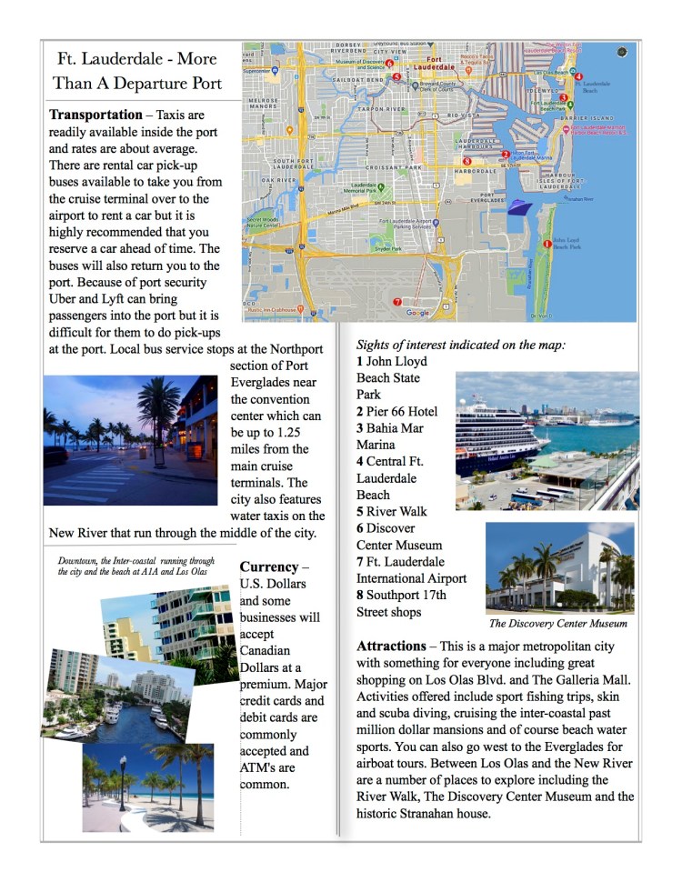 Ft. Lauderdale is a popular South Florida tourist destination as well as a major cruise departure port that has much to offer. As a cruise departure port it has the unique advantage of being located within two miles of its international airport. As a tropical vacation city it boasts some of the best beaches in America.