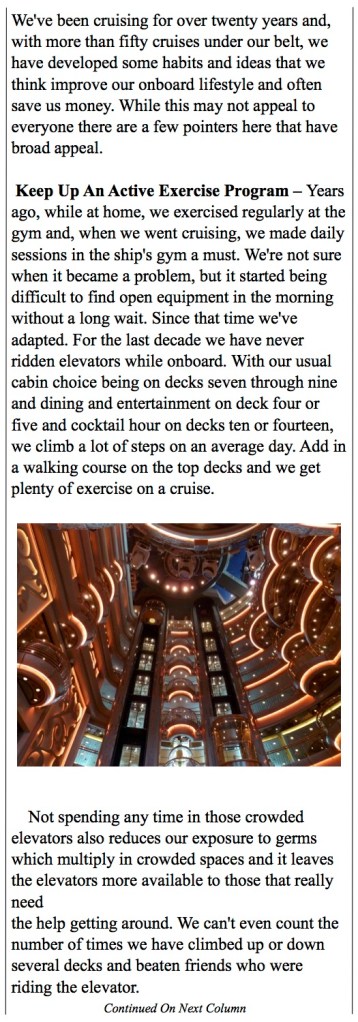 Taking a cruise? Must have items to pack, ideas for keeping in shape and tips to stay on budget while onboard. Happy cruising