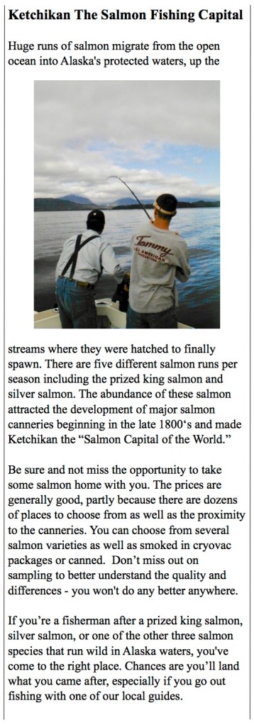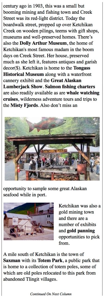 A popular Alaska port of call and a fishing Mecca near to adventure tour destinations. Misty Fjord trips, wildlife and whale watching are favorite activities.