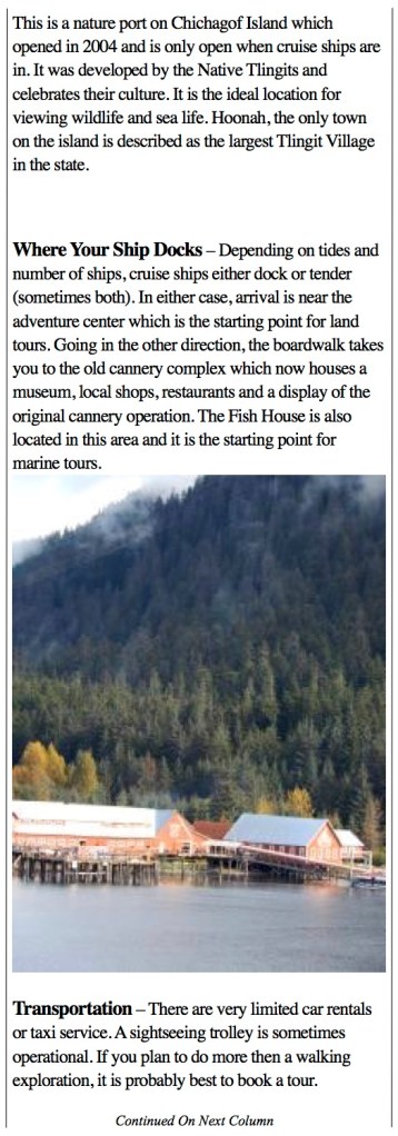 Alaska’s Port of Icy Straight Point Posted byThe Intentional TravelerJuly 2020Posted inAmerica, Cruise Ports of Call, Cruising A frequent cruise port in Alaska popular for scenery, whale watching and good hiking trails. Share this: Click to share on Facebook (Opens in new window) Facebook Click to share on Pinterest (Opens in new window) Pinterest Click to share on Pocket (Opens in new window) Pocket Click to share on X (Opens in new window) X Like Loading... Related