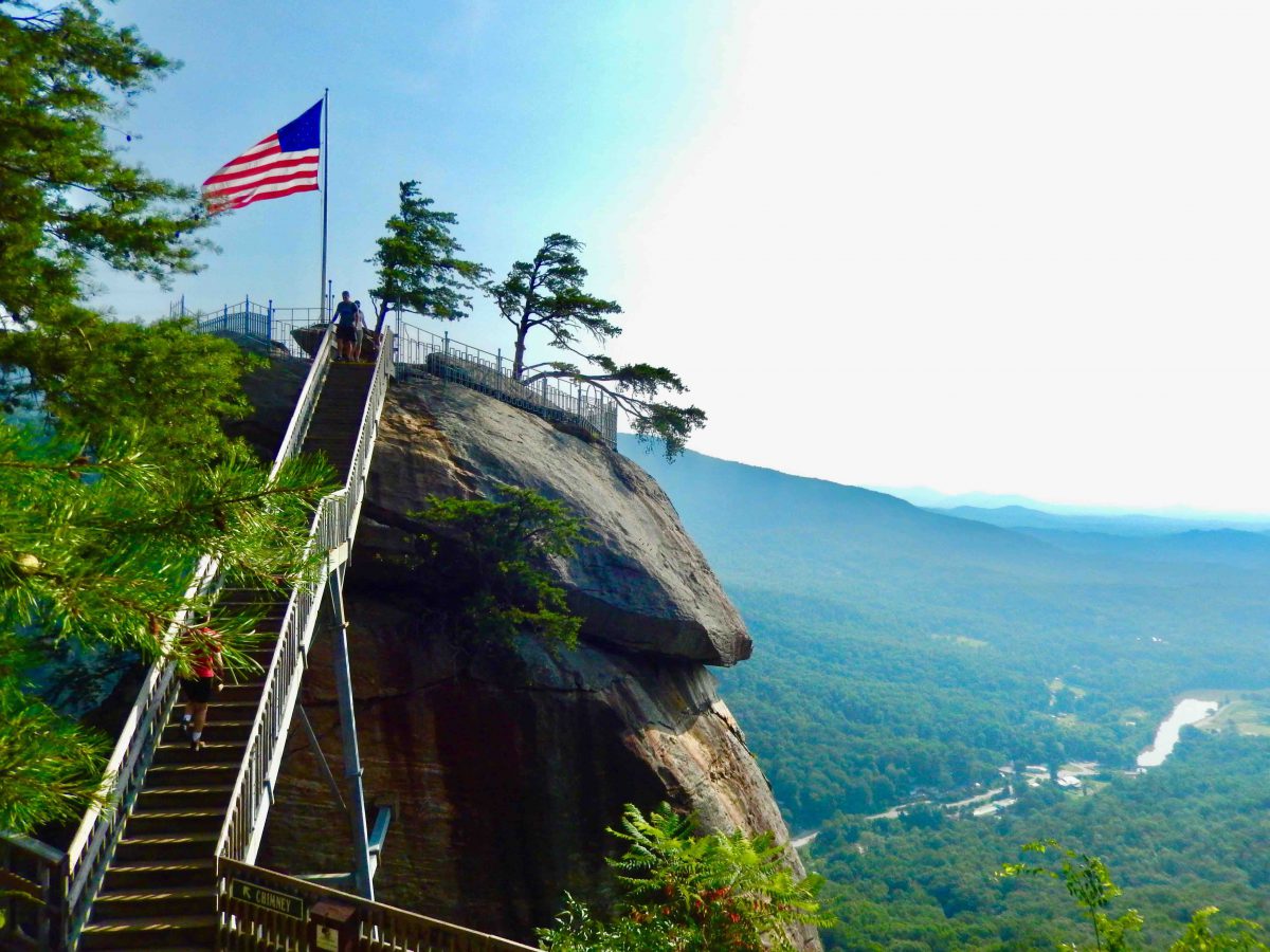 Chimney Rock is a small tourist town nestled down in Hickory Nut Gorge with the attraction being the namesake rock formation standing on a cliff above the town. The buildings on the main street seem to alternate between small restaurants and souvenir shops. The Broad River Inn also runs an attractive miniature golf course along the edge of Broad River and you will find a good day of hiking and exploring at Chimney Rock Park.