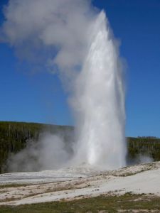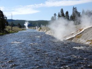 #1 Grand Prismatic Spring – Located in Midway Geyser Basin. This area may be small, but it leaves a lasting impression. In addition to Grand Prismatic Spring, there’s Excelsior Geyser, an enormous geyser crater, and the Turquoise and Opal Pools. You reach the field by a bridge across the Firehole River where boiling water flows into the river and steam rises from around the field. This location is very popular and the secret is to get up early and making this your first stop. On most days gridlock begins to set in around noon.