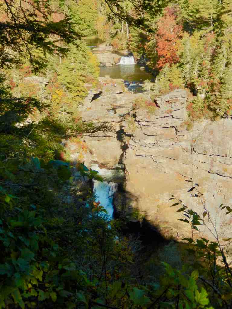 The Linville Falls are near milepost 316 about a mile North of a route 221 entrance features a Visitors Center, camping and picnic tables. The Linville River flows placidly by the Visitors Center, next to a large parking lot, featuring a bridge and some easy level nearby hiking trails.