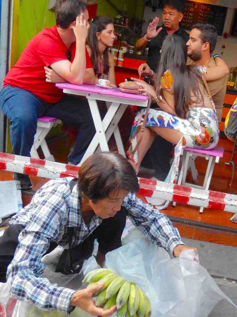 We arrived in the morning as we were warned that by afternoon on a warm day the smells of the seafood can get a bit overwhelming. The market was packed with shoppers along with a fair number of tourists as we all walked along the tracks. On either side there were a number of cafes with the side on the tracks wide open and people sitting and enjoying coffee and tea. At one end most vendors were displaying produce with a couple of hard goods merchants here and there.