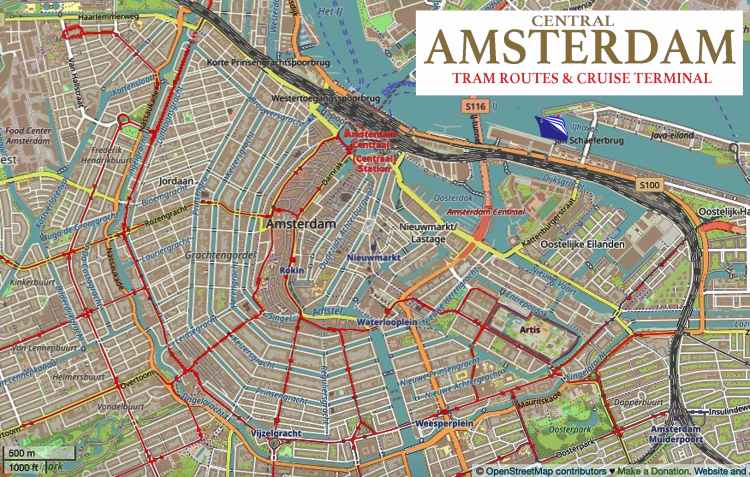 The city is laid out like a fan with major streets radiating out from the Amsterdam Central Train station. The major canals arc across the fan along with a number of city streets. Most major streets are serviced by trams which run every few minutes.
