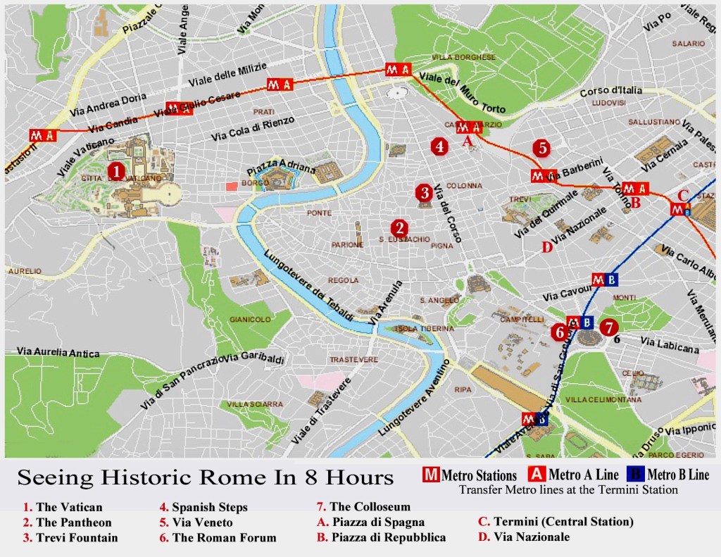 Of course you can take taxis between the various locations. You should expect to pay 15 to 20 Euros per ride between the locations discussed. A better option is rapid transit but in Rome it is somewhat fragmented. The fare system is totally integrated though, so you can pay and use the Metro trains and buses on the same ticket. A minimum fare is a BIT Standard ticket for one ride and costs about $2 per person. Our recommendation is a 24 hour pass for about $9. There are ticket machines at all Metro stations and they accept most major credit cards.