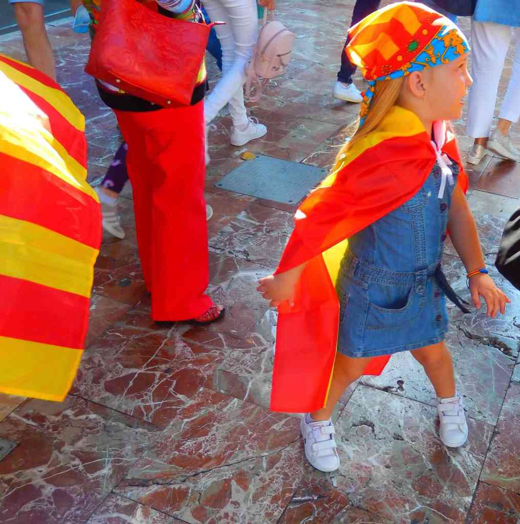 As we walked on toward the central city the police presence kept growing with police helicopters starting to hover overhead. More armored cars sitting on side streets and mounted police in parks. The crowds were growing a lot larger with the Catalan flag everywhere and often draped over peoples shoulders. Attempts to take pictures of the police got immediate reactions convincing me that it wasn’t something I should do. Paying attention to the patches on police uniforms and insignia on armored vehicles it seemed the local police were way outnumbered by the Spanish Civil Guard and National Police Corps. Both of those being para-military arms of the central government.