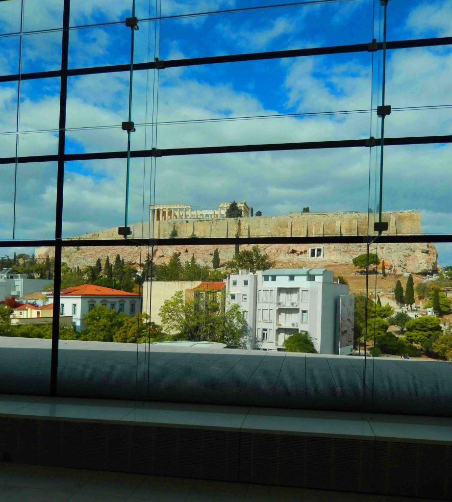 The collections of the museum are exhibited on three levels with a fourth middle level that houses the museum shop, the café and offices. On the first level of the museum there are artifacts from the slopes of the Acropolis with its long and rectangular hall whose floor is sloping to resemble the ascension to the Acropolis. At the top the visitor finds a large hall which houses additional findings that include artifacts and sculptures from the other Acropolis buildings such as the Erechtheum, the Temple of Athena Nike and the Propylaea and artifacts from Roman and early Christian Athens. The top floor features a movie on the Parthenon along with exhibits on the statuary restorations and an amazing gallery with its glass wall looking directly at the Acropolis.
