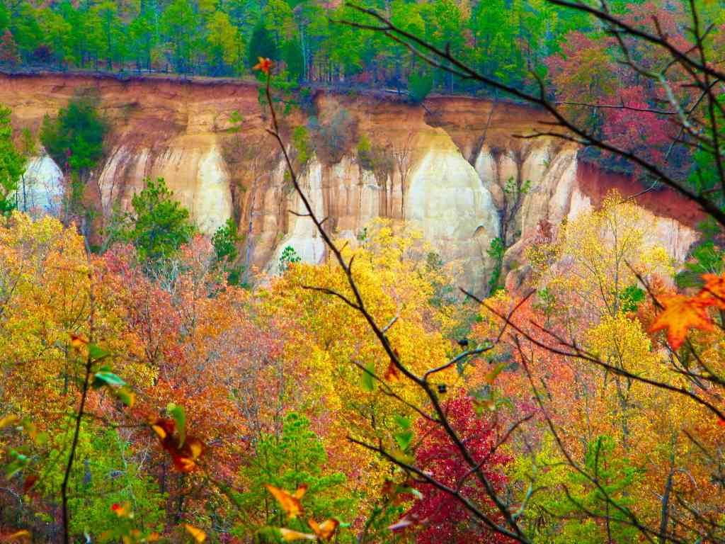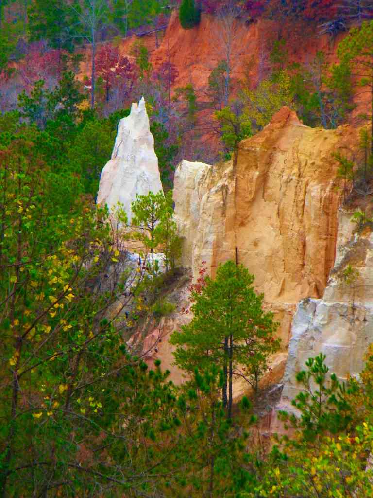 Providence Canyon is a network of gorges, gullies and a plateau created by erosion through multicolored layers of clays and soils. Referred to as “Georgia’s Little Grand Canyon,” Providence Canyon consists of an area of plateaus, cliffs, and narrow pinnacles where erosion has exposed a geologic record going back several million years.
