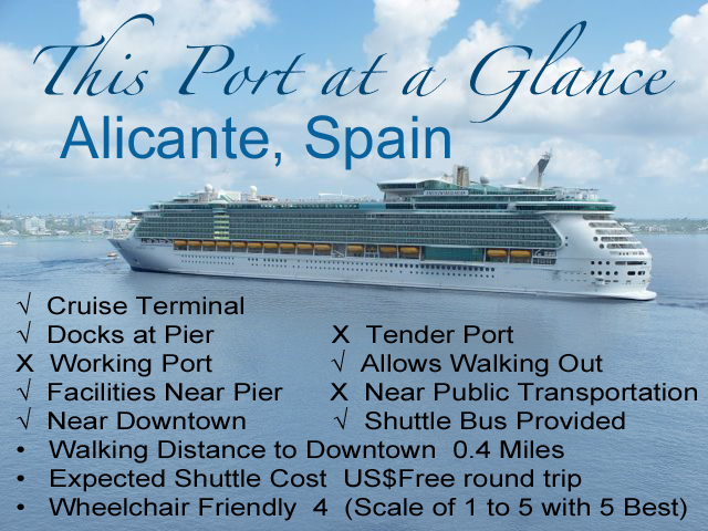 Cruise ships dock at the Alicante Cruise Terminal, an excellent facility behind the cities large marina and very near the center of the city waterfront. Normally the city also provides free shuttle buses to get passengers from the terminal to within a couple of blocks of the Explanada de España.