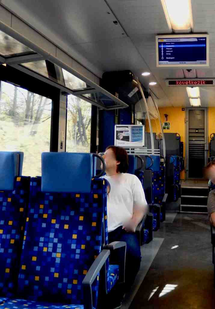 Not happy to have to start our trip with a local train ride for an hour, we got to the station and made the train. About a half hour into the trip the conductor came by to check our ticket and launched into a long explanation in Hungarian with the word bus thrown in several times. Acting like a stupid American, I asked a number of questions in English that resulted mostly in weak smiles and shrugs. Finally a woman sitting a few rows back intervened with some broken English. The explanation turned out that the tracks were out before Szob and we would be transferred to buses for the leg into Szob. We asked what station we’d get off at but that produced no answer we could understand. When in doubt – just follow the crowd. The air wasn’t working on the train and the temperature had climbed again to 94°F.