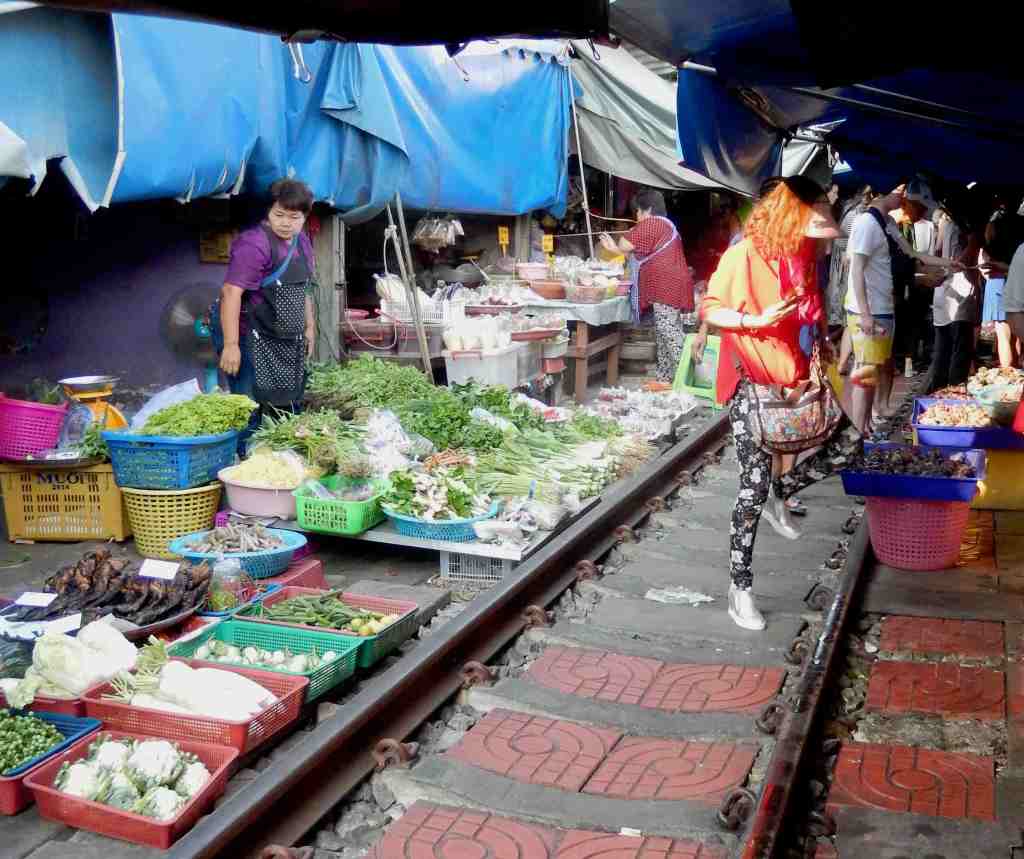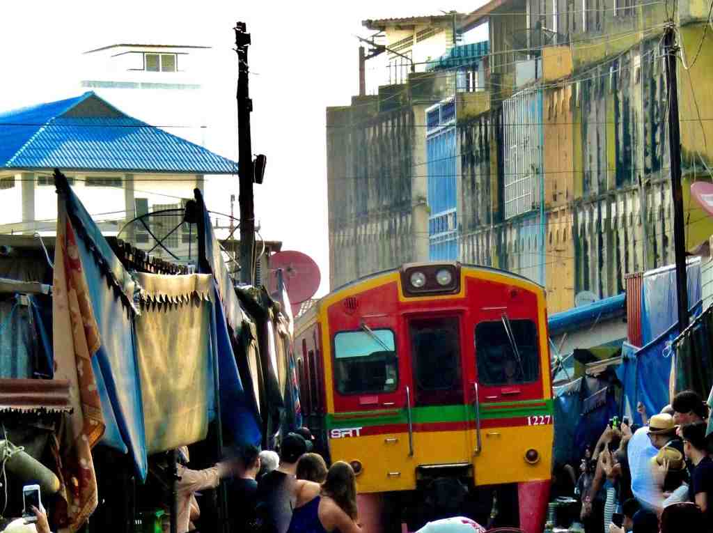 Thailand is also famous for floating markets where goods are sold from boats. Originally developed when rivers and canals played an important role in daily life, most floating markets operating today serve primarily as tourist attractions. One unique market is the Famous Maeklong Railway Market. It is located in a congested town and sits right on an active train track. As trains approach vendors pull back their awnings and displays with only minutes to spare and are right back in business as soon as the trains pass. A unique experience as you stand there with train only only inches away.
