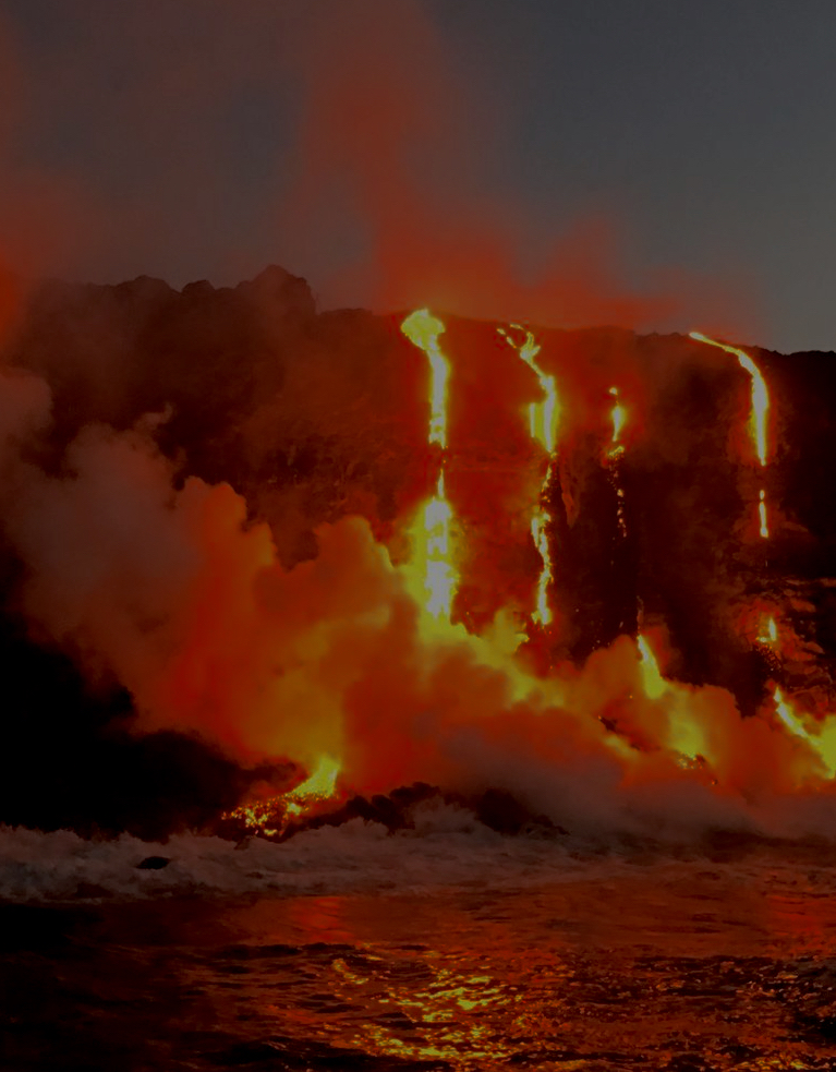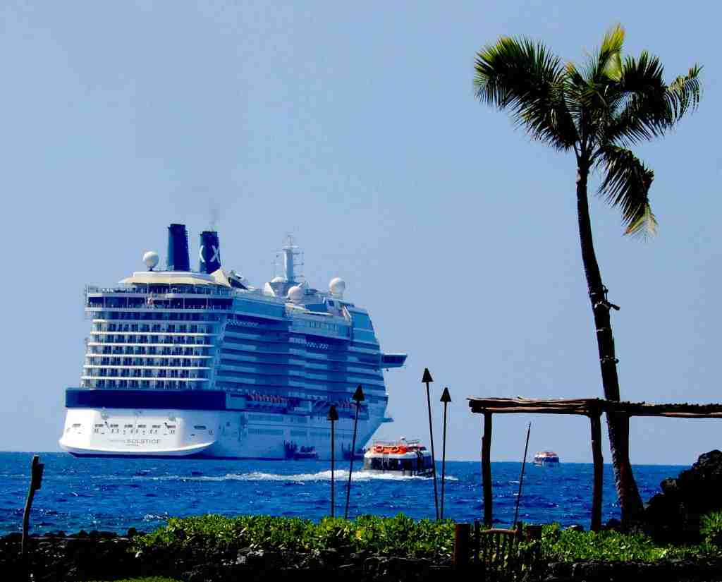 Often cruise ships will make port calls twice on Hawaiʻi. One at Hilo and the other at Kona (Kailua-Kona). Depending on the itinerary most ships will cruise the south shore where lava from Kilauea pours constantly into the Pacific ocean. The cruises can be anywhere from early in the morning to late at night. Anytime day or night the show is spectacular with billowing clouds of steam rising above the orange hot lava as it pours into the sea.