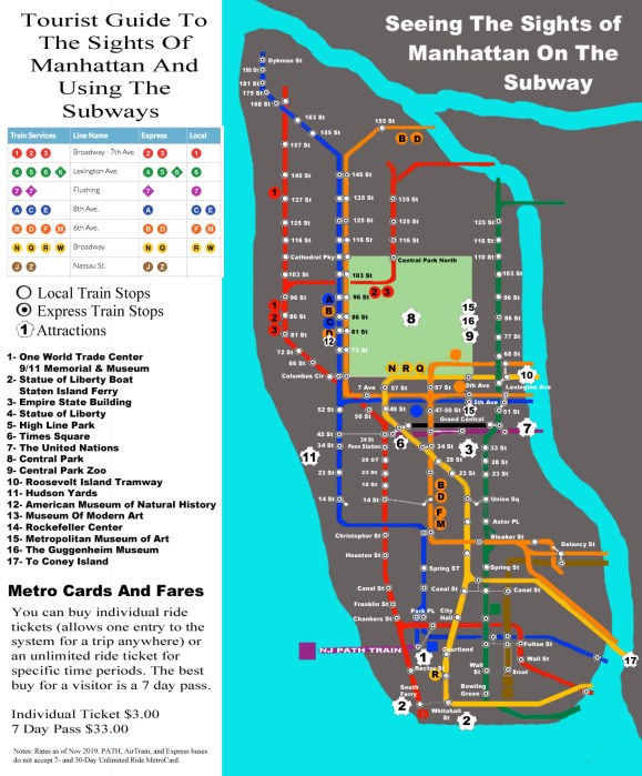 The New York subways are a fast way to see Manhattan and this map eliminates everything but the Manhattan stops and the locations of major sites and attractions.