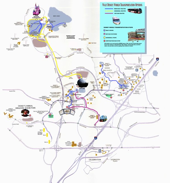 Disney World Transportation Systems– Larger than New York’s Manhattan the Disney people have provided an efficient system to get you around that includes buses, boats, monorails and cable cars.