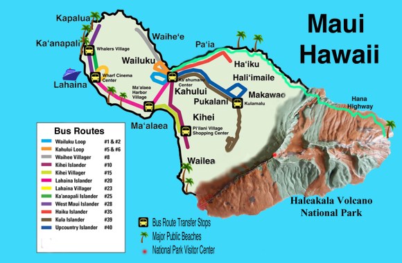 Bus routes on Maui, Hawaii – This island has an incredible public bus system that will take you around the whole island except up through the National Park.