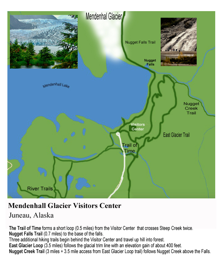 Mendenhall Glacier – Hiking trails around the glacier and the glacial lake in the National Park outside Juneau Alaska.