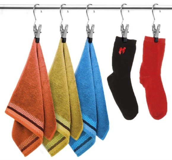 Multi-Use Hanger Clips – These are worth their weight in gold. Perfect for hanging delicates in the shower. 16 Pieces of Stainless Steel Portable Clothespins with hooks.