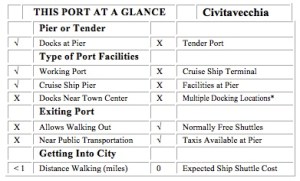 Transportation – The best way to get into Rome is to take a train. From Civitavecchia a typical trip to Rome stops at the Vatican station or S. Pietro (40 mins), Trastevere (50 mins), Ostiense (55 mins) and finally the central Termini (70 mins). Fare starts at €5 one way but can cost up to €25 round trip depending on the train service and ticket class (the commuter trains are the least costly). There is a manned ticket booth at Civitavecchia station along with automated ticket vending machines with instructions in several languages.