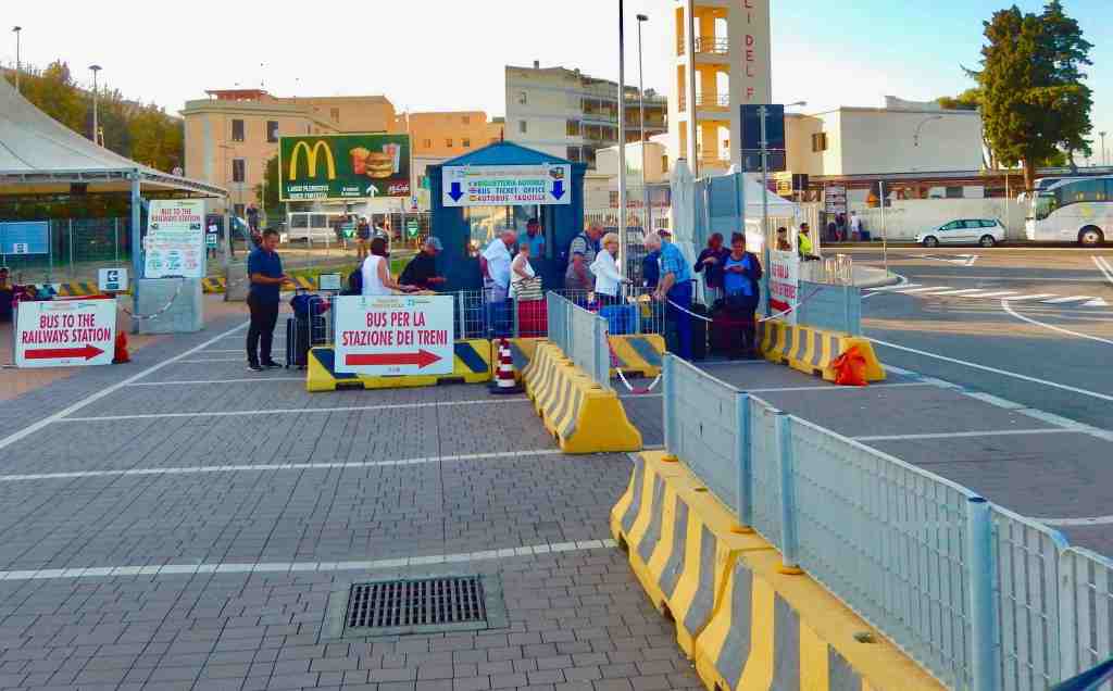 Civitavecchia is a seaside city and the port serving the city of Rome. The city is serviced by frequent train service from Rome along with service to other Italian cities. The Cruise port is only a short eight block walk along the waterfront on Via Aurelia from the train station (Note: Currently the cruise buses are not running from the main port entrance but from a port entrance six blocks farther west – see note in red and the map below). Once inside the port gate there are free shuttles to the cruise ships. There is an open air bus area with current ships marked on the buses. Often the port runs free shuttles to and from the Civitavecchia train station.