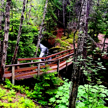 Lower Dewey Lake Distance: 0.9 mile to the lake and 3.6 miles around lake. To get to the trailhead go east on 2nd Ave. past the railroad depot. Where the railroad tracks cross the road turn left and follow the tracks 500 feet north to the trailhead. A short distance up the hill the trail branches off to the right (continuing straight up the hill is a steep power company maintenance road). Descend the wooden staircase, duck under the water pipe, and continue up the hill. The trail jogs left and crosses a short footbridge. Here the trail continues on a steep main uphill for about 300 feet. There is a clearing and rock bench at the top of this incline with a view of town and the harbor. Continue up the steep switchback trail staying to the right at each fork. Notice where the trail appears to be going straight ahead but actually turns sharply right. Going straight here leads to a reservoir and trail to the north end of the lake. It is advised to take the sharp right to access the lake. Shortly ahead at the junction sign the terrain levels out. At the lake turn right and walk along the west shore of the lake. Follow the rolling trail to the south end of the lake. Turn left here across the earthen levy and spillway to hike the rougher trail around the east side of the lake, where you will have to scramble over a few rocks before bearing left to rejoin the main trail and return to the trailhead.