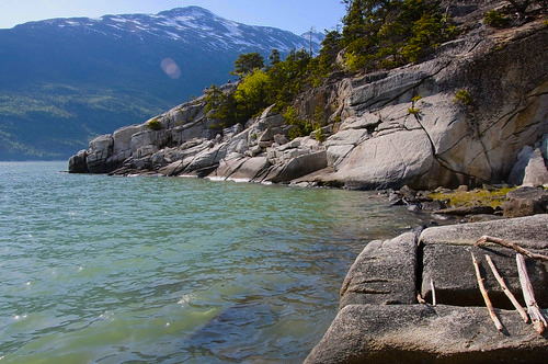 Yakutania Point Distance: 1 – 2 miles round trip, Rated Easy. (This trail connects to the Smuggler’s Cove trail.) To get to the trailhead walk west along 1st Ave., turn left at Main St. and travel south two blocks. Follow the sidewalk west past the airport terminal. Start by crossing the Skagway River footbridge and turn left, following the clearly marked trail into the forest and past a number of exercise stations. After exercise station #4 the footpath narrows and ascends rock steps. Continue along past the restroom and down more rock steps, past a picnic shelter where a rock outcropping provides a view looking down the Lynn Canal toward the Chilkat Mountains.