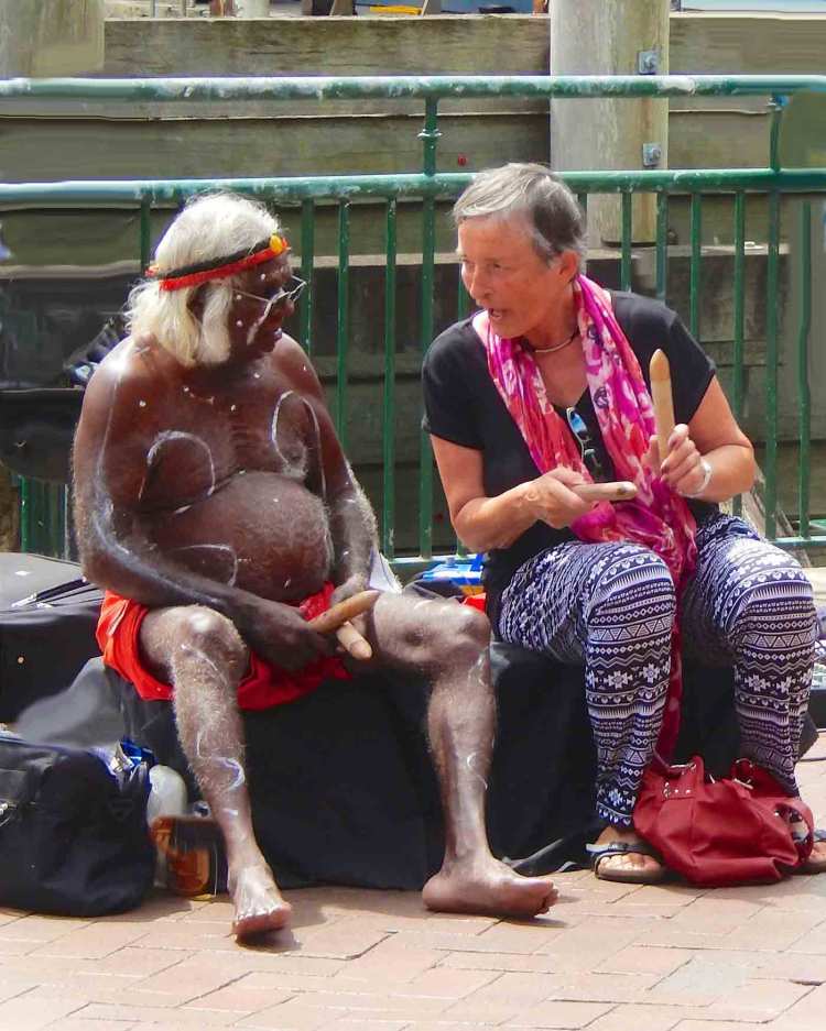 An Aborigine offers music instruction to a tourist near the Sydney Opera House. I know, but this is legit. These are actually Aboriginal clapsticks, bilma, clappers, or music sticks, and they are a traditional Australian Aboriginal instrument usually used in conjunction with the didgeridoo. They’re also used to maintain rhythm in chants, often as part of an Aboriginal ceremony and often are ornately carved or colorfully decorated.