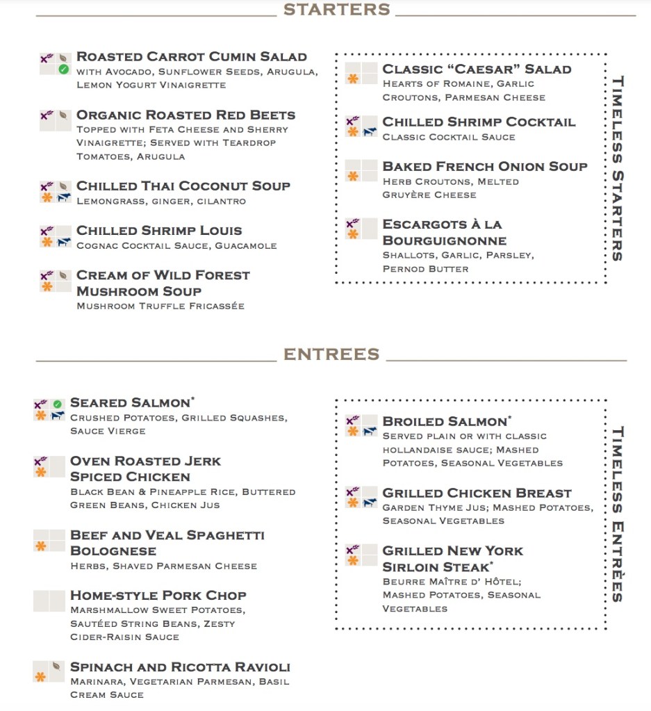Before you cruise it is possible to visit some cruise line websites and look at typical menus along with exploring speciality dining restaurants. Below you’ll find recent sample menus from main dining rooms on Royal Caribbean, Carnival and Celebrity.