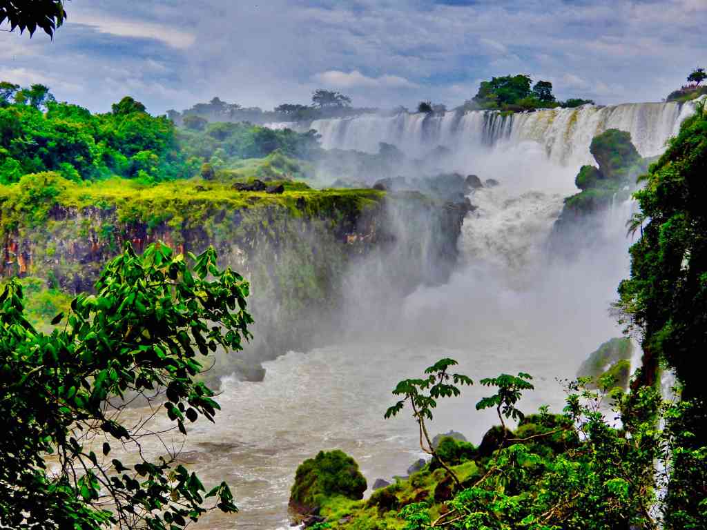 Picture a wide, slow moving river flowing through tropical jungles around hundreds of islands thick with trees. The water at the nearer bank flattens and slowly spreads out into jungle, while the far side narrows and seems to funnel into a U shaped trough. Clouds of mist billow skyward as the trough drops away into a horseshoe shaped rift. The near bank of the river breaks into dozens of channels that seem to fan out farther into the jungle. Down through the jungle a series of rifts fracture the landscape and the land falls away in a jagged line a mile wide. Fingers of the river race to the edge of these rifts and pour over the edge in a swirl of mist as the water roars down through narrow gorges. This is Iguazú Falls, the largest falls complex on Earth.