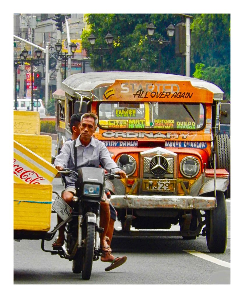 In Manila traffic you’re likely to see almost anything. Motor scooters with trailers, motorcycle delivery vehicles and the ubiquitous Jeepney. The origin of the Jeepney is found in U.S. Army jeeps left behind after WWII. Locals took the jeeps and turned them into minibus like public transportation. After the jeeps were used up Philippine shops started building the Jeepneys from the ground up. Today they are called just Jeeps and in most cities they serve as the most popular means of public transportation. They are known for crowded seating and outlandish decorations and are a symbol of Philippine culture and art. After taking this photo I was also fascinated by the sidecar delivery motor scooter and the passenger’s flip flop almost falling off…