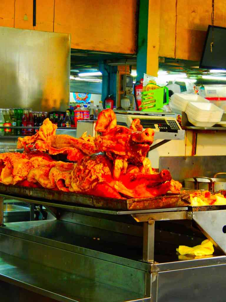 A central market in Cuzco, Ecuador offering fresh fruit, vegetables, flowers (2 dozen long stem roses for US$1.60) and assorted meats. There were numerous stalls offering fresh cooked meals and it seemed a popular place for lunch. Gave me a new perspective on the expression “the whole hog”.