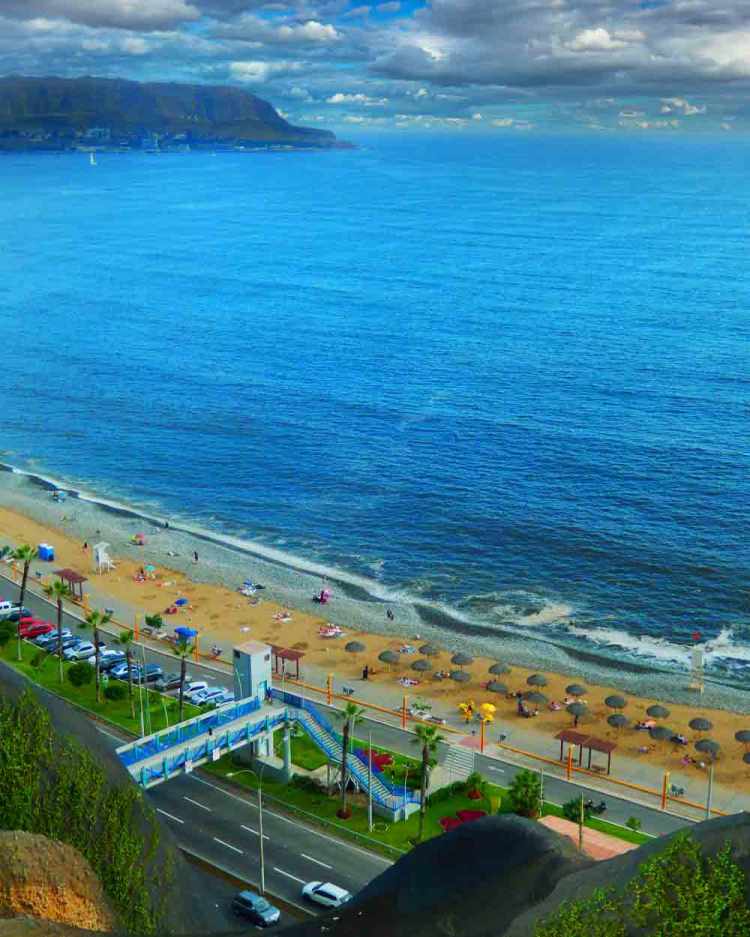 Lima beach in Miraflores, Peru viewed from the amazing El Malecón. Imagine eleven miles of beautiful beaches laid out right next to metropolitan Lima. The beaches are below a rugged coastline capped by a fantastic trail along its cliff tops called El Malecón. The Miraflores section boasts a large, upscale shopping center, several beautiful parks and the Pacific Ocean.