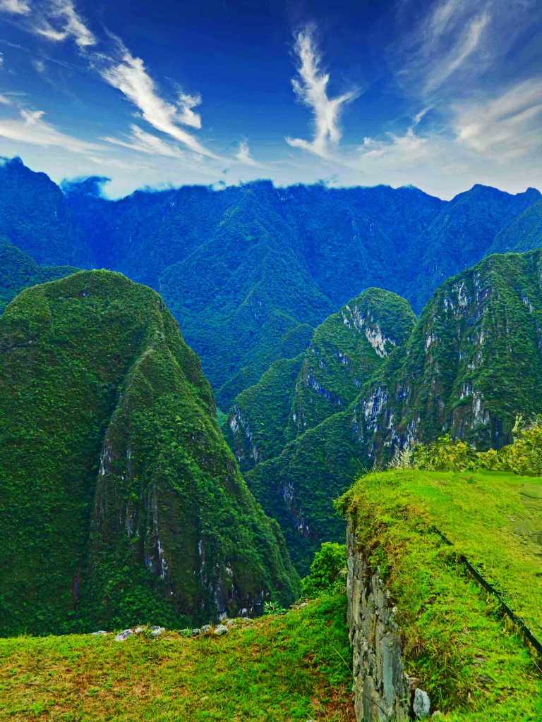 Nestled amongst the peaks of the Andes, Machu Picchu is perched above the Urubamba River valley on a narrow saddle between two higher peaks—Machu Picchu (“Old Peak”) and Huayna Picchu (“New Peak”)—at an altitude of 7,710 feet. For an Inca emperor that’s one hell of view from your front porch.