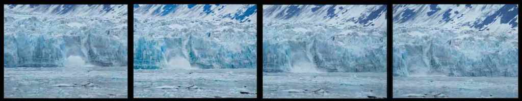 The Glacier calves into Disenchantment Bay. Catching pictures is a challenge as the sound of the event is what draws your attention but being a half mile or more away by the time you hear it, it’s already half done. Fun trying…