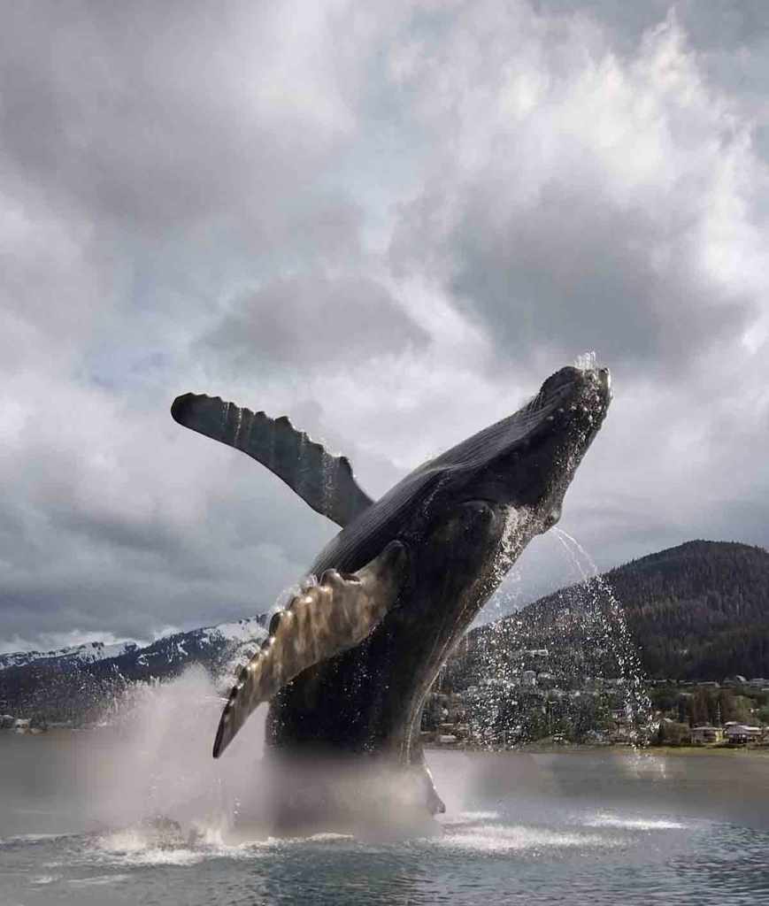 We’ve spent a lot of time at sea and whales always attract attention. Having seen and photographed a number of whale flukes as they surface, with that iconic view of the tail up out of the water and sliding back under. Spent hours traveling with a large pod of humpbacks seeing mostly backs at the surface and the erupting mists from multiple blows but we’ve never seen a breaching whale erupt almost fully out of the water like in the the above image. Sadly that remains the case – this photo is of the Whale Project in Juneau Alaska.