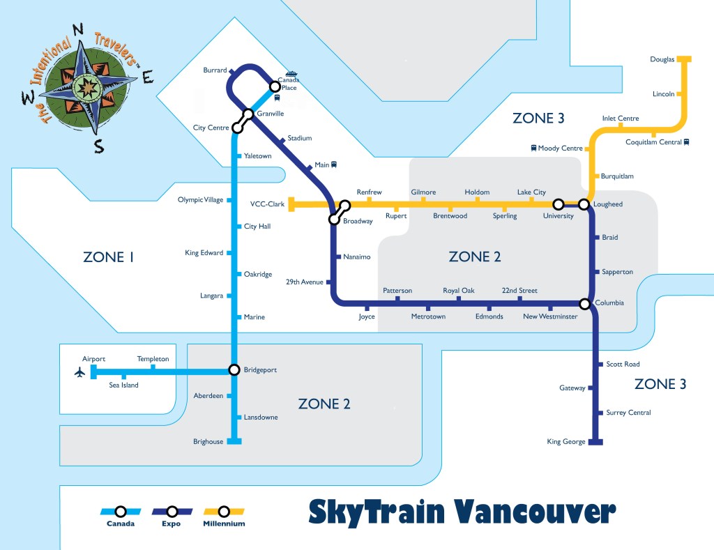 There are three fare zones across Metro Vancouver. The number of SkyTrain boundaries you cross during your trip determines the fare, depending on the time of day and number of zone boundaries you cross during your trip.