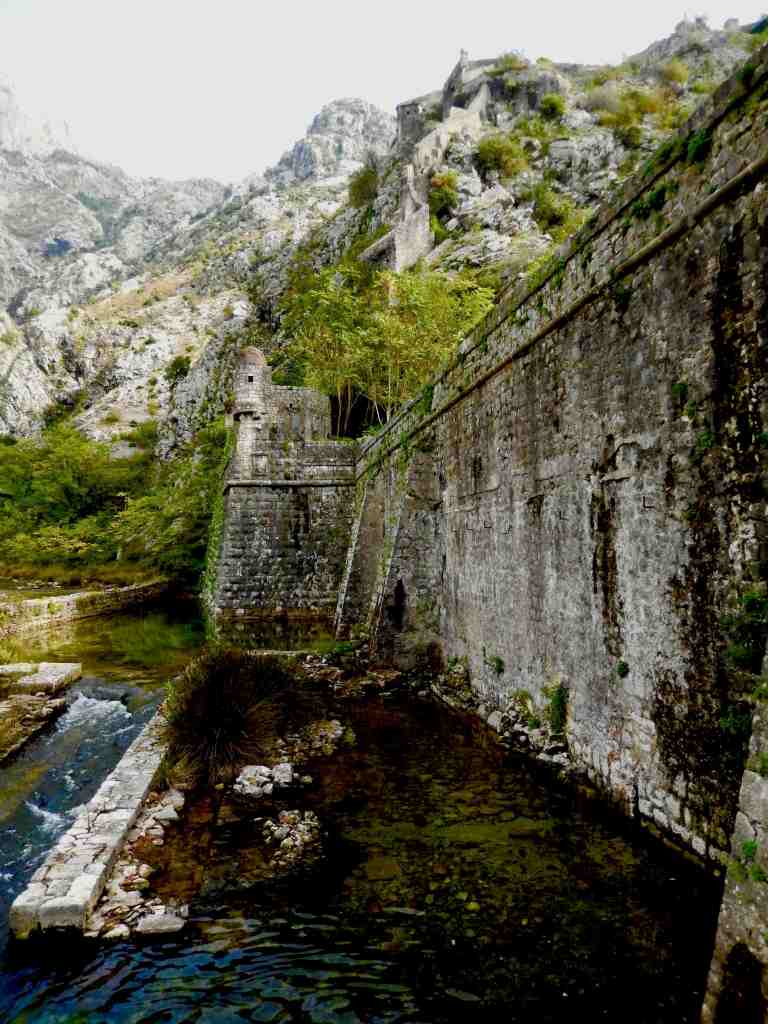 The old port of Kotor is ringed by steep limestone mountains and surrounded by fortifications built from the Roman era to the Venetian period. It is located on the Bay of Kotor deep inland from the Adriatic Sea. The bay is actually a ria, which is a filled-in river canyon. Together with picturesque towns, the nearly shear limestone cliffs of the mountains of Orjen and Lovćen, Kotor provides an impressive landscape. The current population of Kotor is under 15,000.