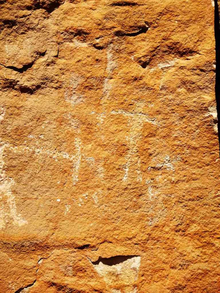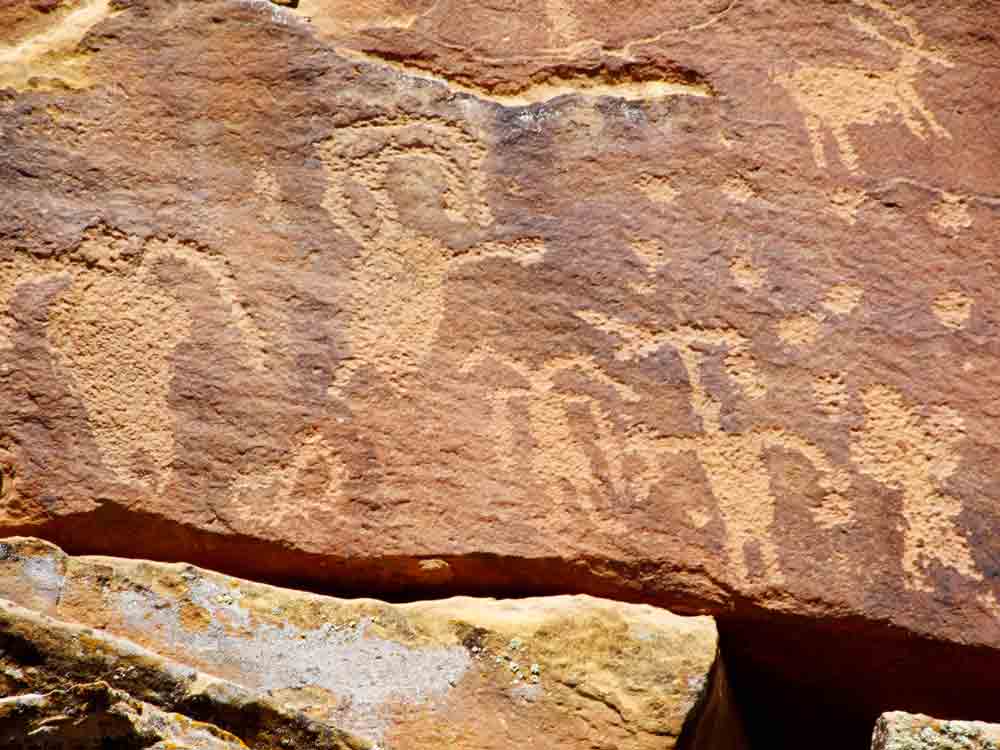 Go 1.8 more miles to another petroglyph panel showing men, women, a turkey, a scorpion, a bird and abstract sketches.