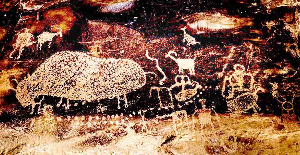 In the remote Utah desert, about 125 miles south from Salt Lake City, is Nine Mile Canyon. The area is filled with tens of thousands of petroglyphs and pictographs, some thousands of years old. The earliest were produced by hunter-gatherer cultures of the mid-to-late Archaic periods from almost 7,000 years ago, more were produced by members of the Fremont culture from 500 BC to 1200 AD, and the protohistoric Ute and Shoshone tribes 1200 BC to 1850 AD. The artists who created these rock images were witness to dramatic environmental shifts. Lake Bonneville shrank into todays Great Salt Lake while lush vegetation and plentiful wildlife vanished into desert. The creators of 9 Mile Canyon petroglyphs are numerous indigenous people who lived in these canyons for thousands of years. These petroglyphs are considered a window into America’s distant past.