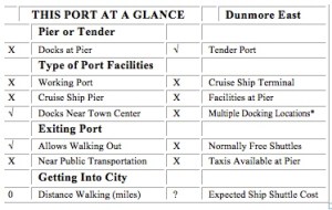The port of Dunmore East is located very near the city of Waterford and while Dunmore East has a small harbor it is not an industrial port. The larger ships visiting are primarily cruise ships. The town itself is a quant seaside village with galleries, gift shops and restaurants and some nice walking trails along the shore. The villages charm and natural surroundings are well worth spending some time ashore. It is a bit isolated however and transportation options are few. It is also a tender port as there are no docks capable of handling large ships.
