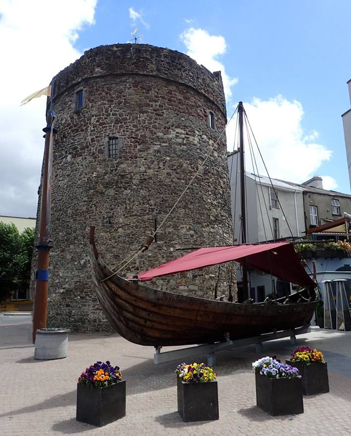 Reginald’s Tower is a historic round stronghold tower in Waterford. It is located at the eastern end of the city quay. The tower has been in use for different purposes for centuries and is an important landmark in Waterford and an important remnant of its medieval urban defense. It is the oldest civic building in Ireland and it is the only urban monument in Ireland to retain a Norse Viking name. Just outside, to the right of the tower entrance, is a 40 foot Viking Long Boat with a red sail named Vadrarfjordr – the Viking name for Waterford. This accurate Viking Longboat was built by a group of Waterford men. The keel and planks of the longboat are of Irish oak, mostly sourced from a mill in Carlow, and the sailcloth is a canvas weave. The Vadrarfjordr longboat is modeled on famous Viking ships found at Roskilde, in Denmark.