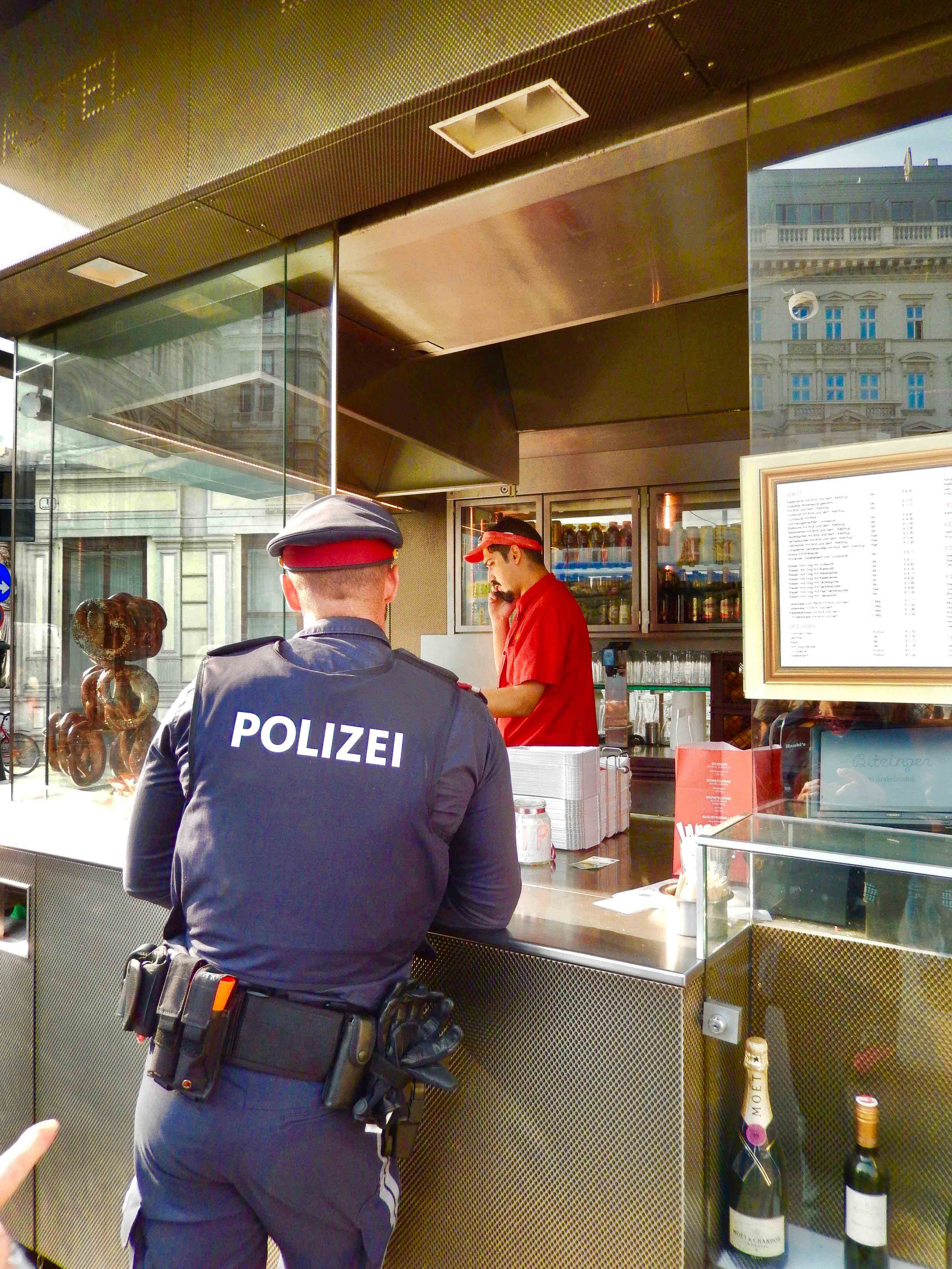Arriving shortly after noon there was a line already formed. The customer directly in front of us was a member of the Polizei, the Austrian police. He provided inspiration for our selection choice as the proprietor was filling a carry away bag with a large number of different varieties of hot dogs/sausages/toppings.