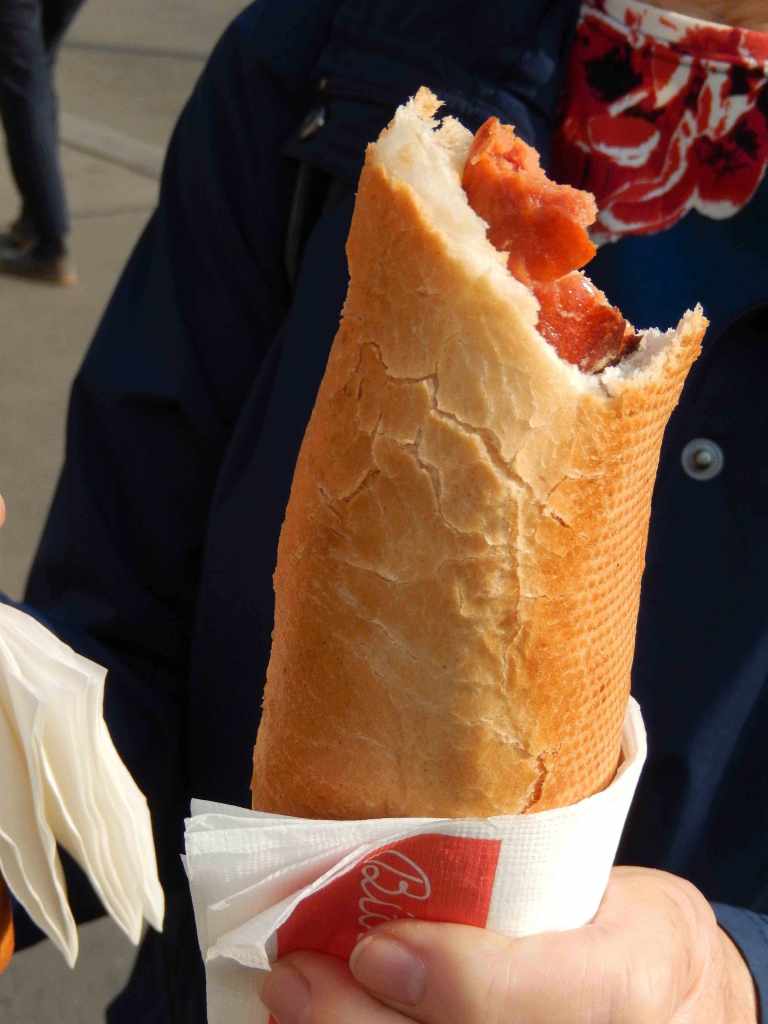Being unable to read the German menu, when it was our turn we very simply asked for two hot dogs, one plain and one with mustard. The preparation process involves having an end sliced, at an angle from what can best be described as a small baguette. The baguette is then pushed down on a stainless spike to make a hole for the hotdog. A squirt of mustard goes into the hole followed by a really good hotdog and then wrapped by a square of foil.