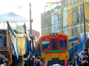 50 miles from Bangkok is the Maeklong Railway Market, the most unique market in Asia. It features vendors (mostly food items) on both sides of the railroad track. They display their products along the tracks and, when the train is coming, they quickly pull everything back until the train passes right through the center of the market. Afterwards, all goods go back by the tracks. This process happens seven times a day but it is best to visit early in the morning when the temperatures and smells are both lower.