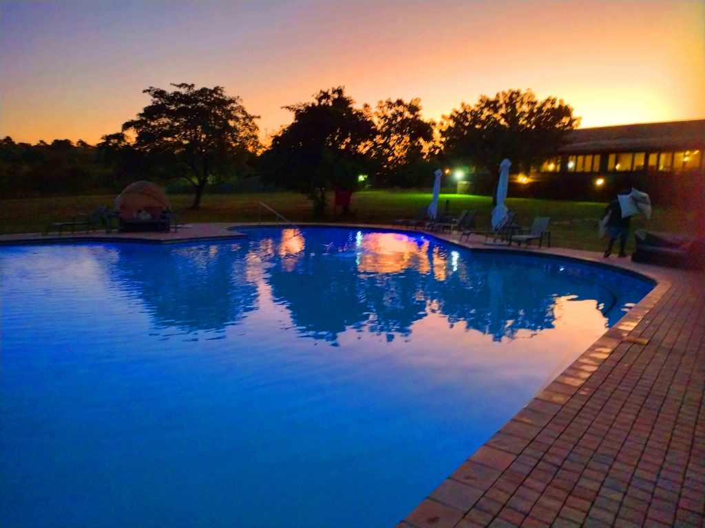 The accommodations were in individual “tents” but it was far from traditional camping. Each tent was spacious, had large beds, air conditioning, electric outlets, and a full bath (with hot water). The camps lodge had a restaurant, an outside dining area with a fire in the evening, a nice lounge and bar. The property also featured a nice swimming pool. Also to reduce the likelihood of unwanted guests surprising you the property is surrounded by electrified fences with a gate that is closed and locked early each evening.