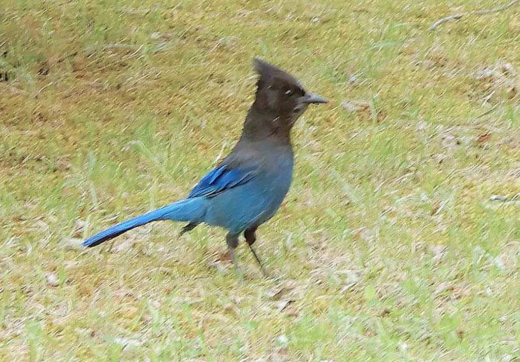 Steller’s Jay – a bird native to western North America, closely related to the blue jay found in the rest of the continent, but with a black head and upper body.