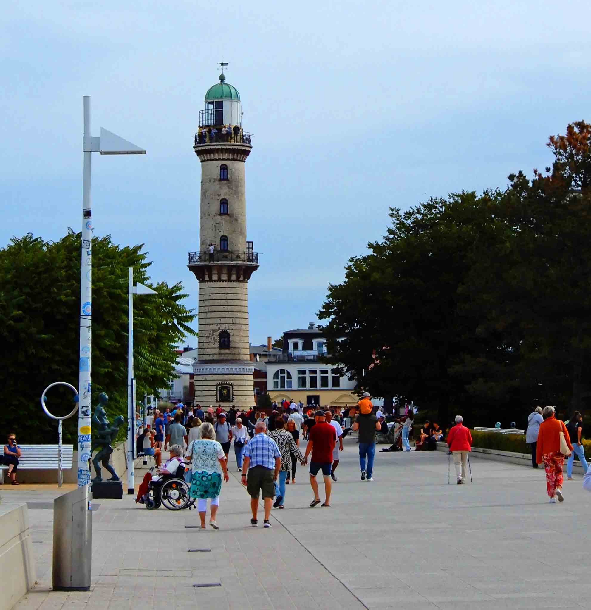 The Warnemünde Lighthouse – An iconic structure that offers stunning views of the Baltic Sea and the surrounding area and is located at the end of a wide pedestrian walkway next to the beach.